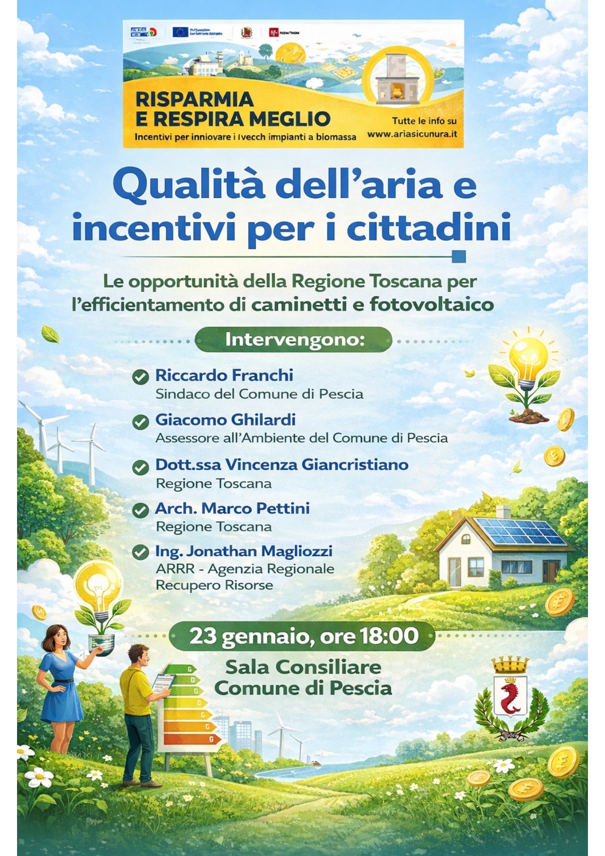 Venerdì 23 gennaio, in Sala del Consiglio alle ore 18, si terrà un incontro sulle opportunità che la Regione Toscana offre alla cittadinanza per l'efficientamento dei caminetti e del fotovoltaico.