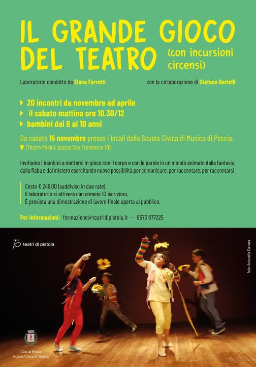 Dopo il successo dello scorso anno, torna, per i bambini dai 6 ai 10 anni, il laboratorio di teatro alla Scuola Civica di Musica di Pistoia, a cura di Elena Ferretti con la collaborazione di Stefano Bertelli.