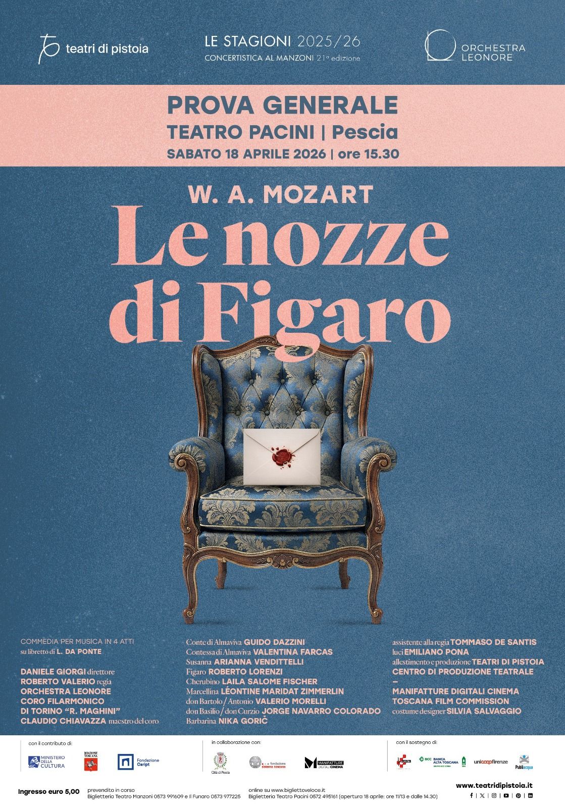 Al prezzo speciale di euro 5,00 (posto unico non numerato) sono in prevendita, fino ad esaurimento posti, i biglietti per assistere alla PROVA GENERALE dell'Opera Le Nozze di Figaro di Mozart, prodotta da Teatri di Pistoia col sostegno di Fondazione Caript (Orchestra Leonore - direttore Daniele Giorgi, regia Roberto Valerio) che si terrà SABATO 18 APRILE alle ore 15.30, al Teatro Pacini di Pescia, grazie anche alla collaborazione con il Comune di Pescia.