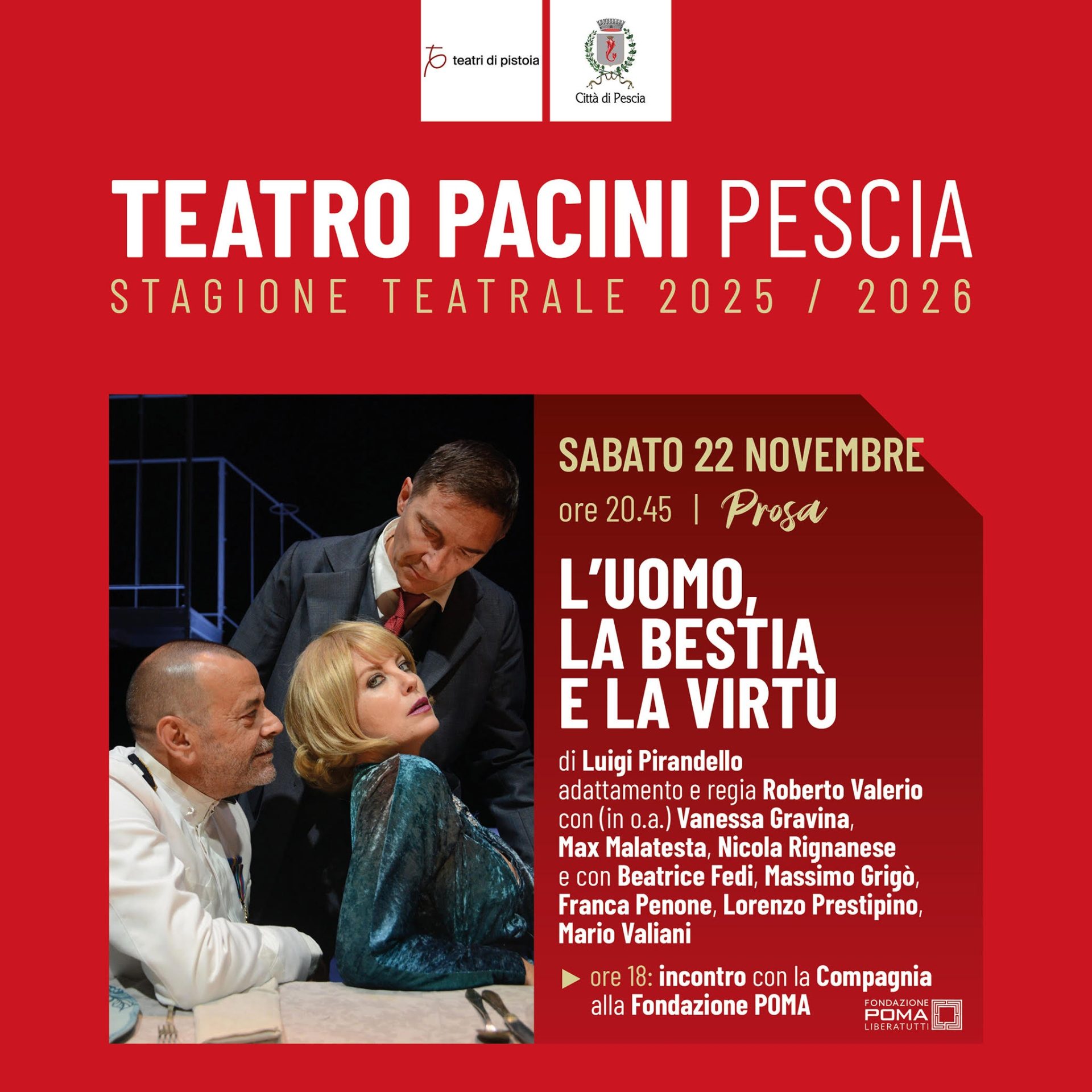 Lui, Lei, l’Altro: il classico “triangolo” sentimentale diventa, nella commedia onirica e folle di Luigi Pirandello, emblema dell’ipocrisia dei nostri tempi. Il professor Paolino (l’Uomo) conduce una vita tranquilla scandita dalle faticose lezioni private ai suoi allievi. Tra questi giovani vi è anche l’undicenne Nonò, la cui mamma è l’affascinante e pudica signora Perella (la Virtù). La relazione clandestina tra Paolino e la signora Perella soddisfa entrambi e tale resterebbe se non capitasse loro un accidente: una gravidanza improvvisa e non voluta. Nessun dubbio sulla paternità, perché il marito della Perella (la Bestia), marinaio di lungo corso spesso assente da casa e a sua volta impegnato in una relazione extraconiugale con un’altra donna da cui ha avuto altri due bambini, si rifiuta ormai da molto tempo di avere alcun tipo di contatto fisico con la moglie… la nuova produzione dei Teatri di Pistoia, per la regia di Roberto Valerio, è proposta in prima nazionale al Giovanni da Udine: il debutto sarà preceduto da alcune iniziative per condividere con il pubblico il momento speciale della nascita di un nuovo spettacolo e vivere anche “dietro le quinte” una Stagione che si preannuncia ricca di gustosi colpi di scena.