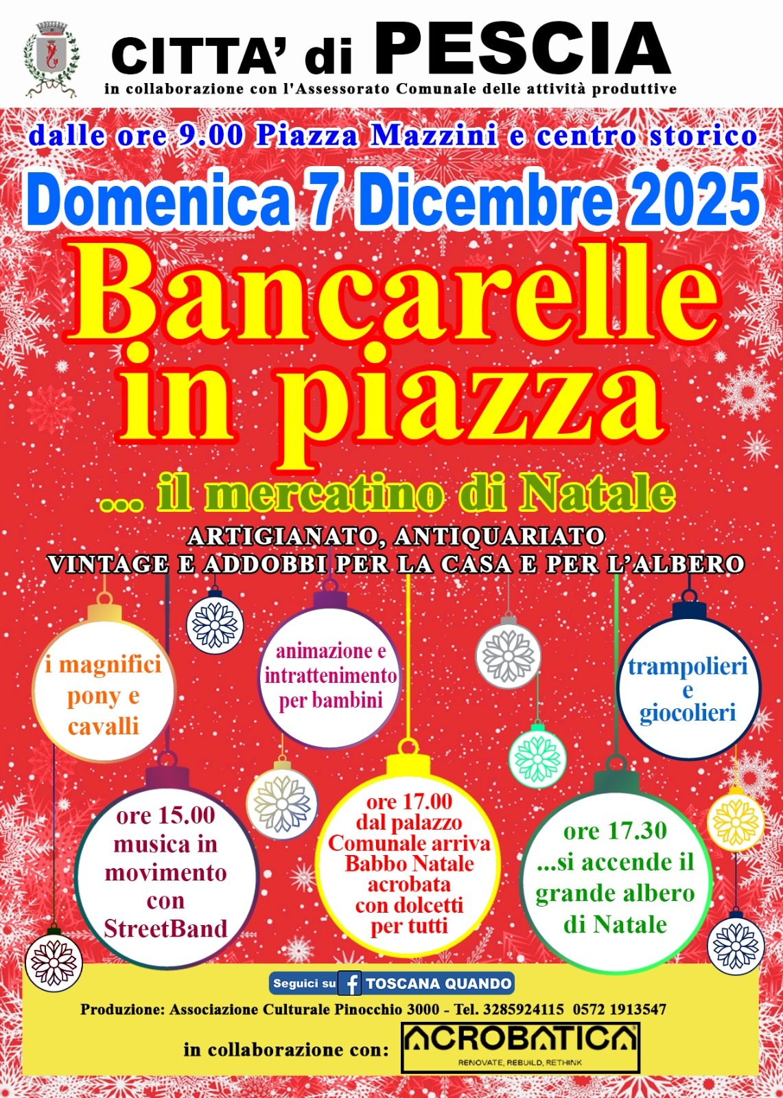 Domenica 7 dicembre , piazza Mazzini ed il centro storico di Pescia tornano ad ospitare, dalle ore 9,oo, le coloratissime bancarelle del mercatino di Natale, prodotto dall'associazione culturale Pinocchio 3000 in collaborazione con l'assessorato alle attività produttive del Comune: iniziano così le manifestazioni previste per le prossime festività.
