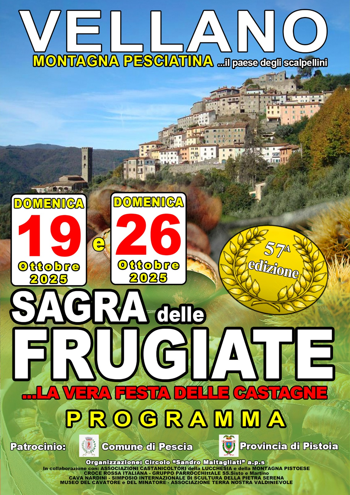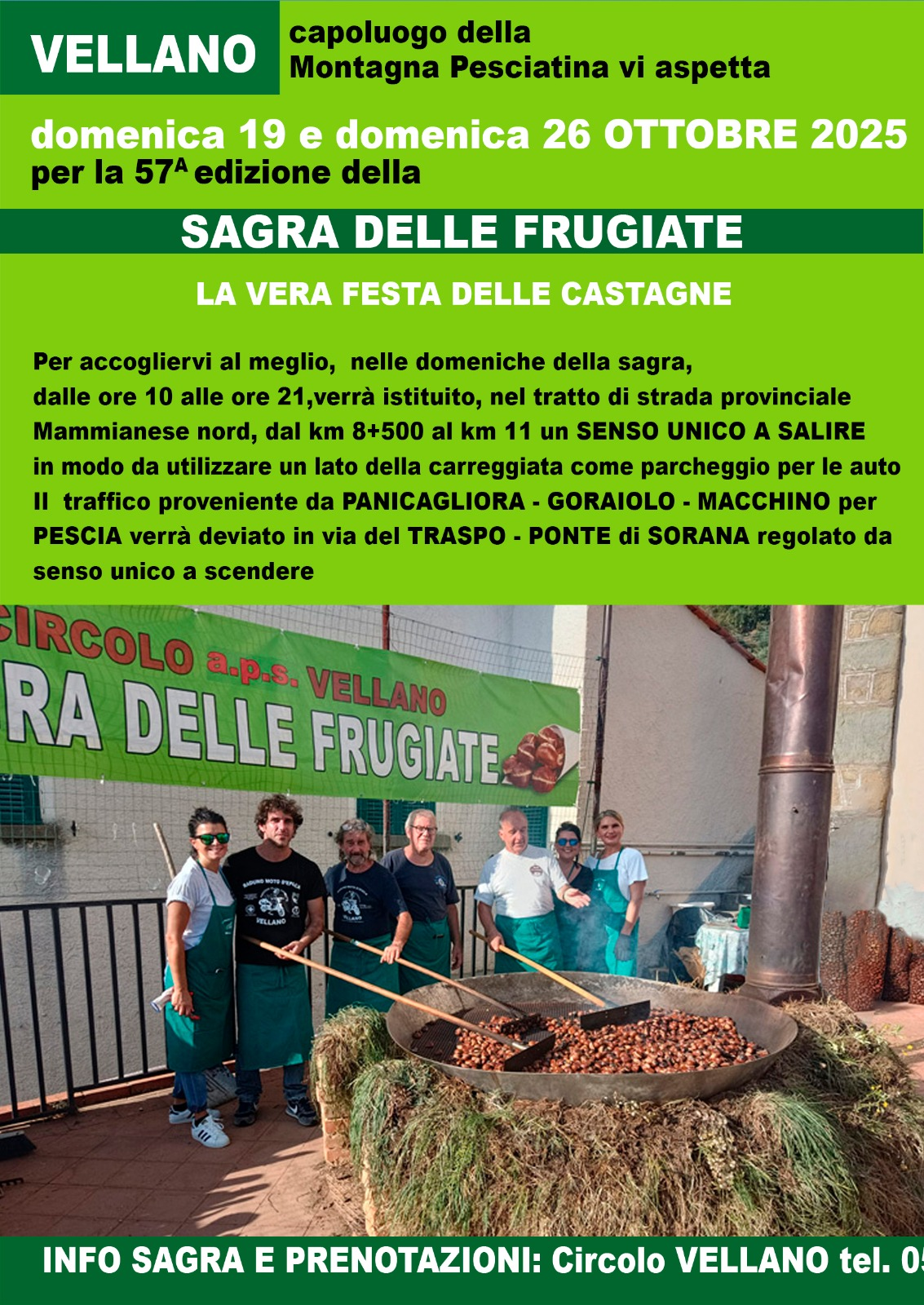 Tra gli appuntamenti toscani più attesi dell'autunno, c'è sicuramente la sagra delle frugiate che da ben 57 anni consecutivi, viene organizzata a Vellano, nel cuore della montagna pesciatina, dal locale circolo ricreativo e culturale.