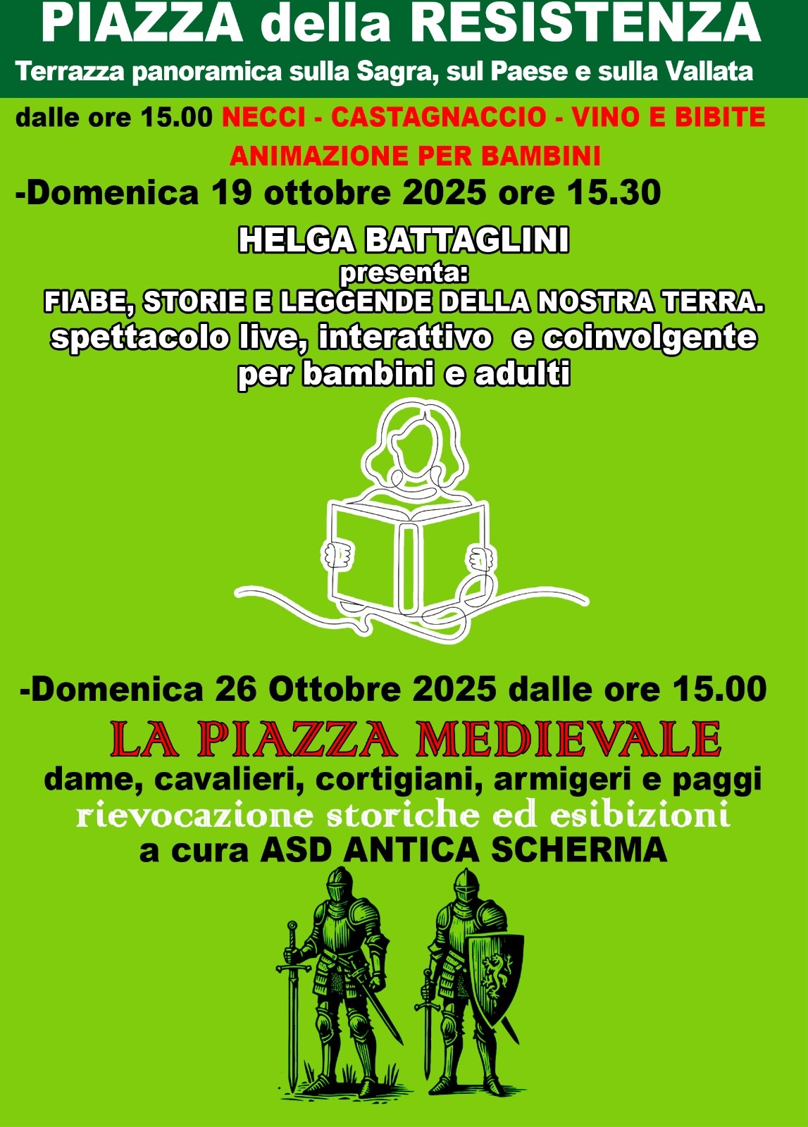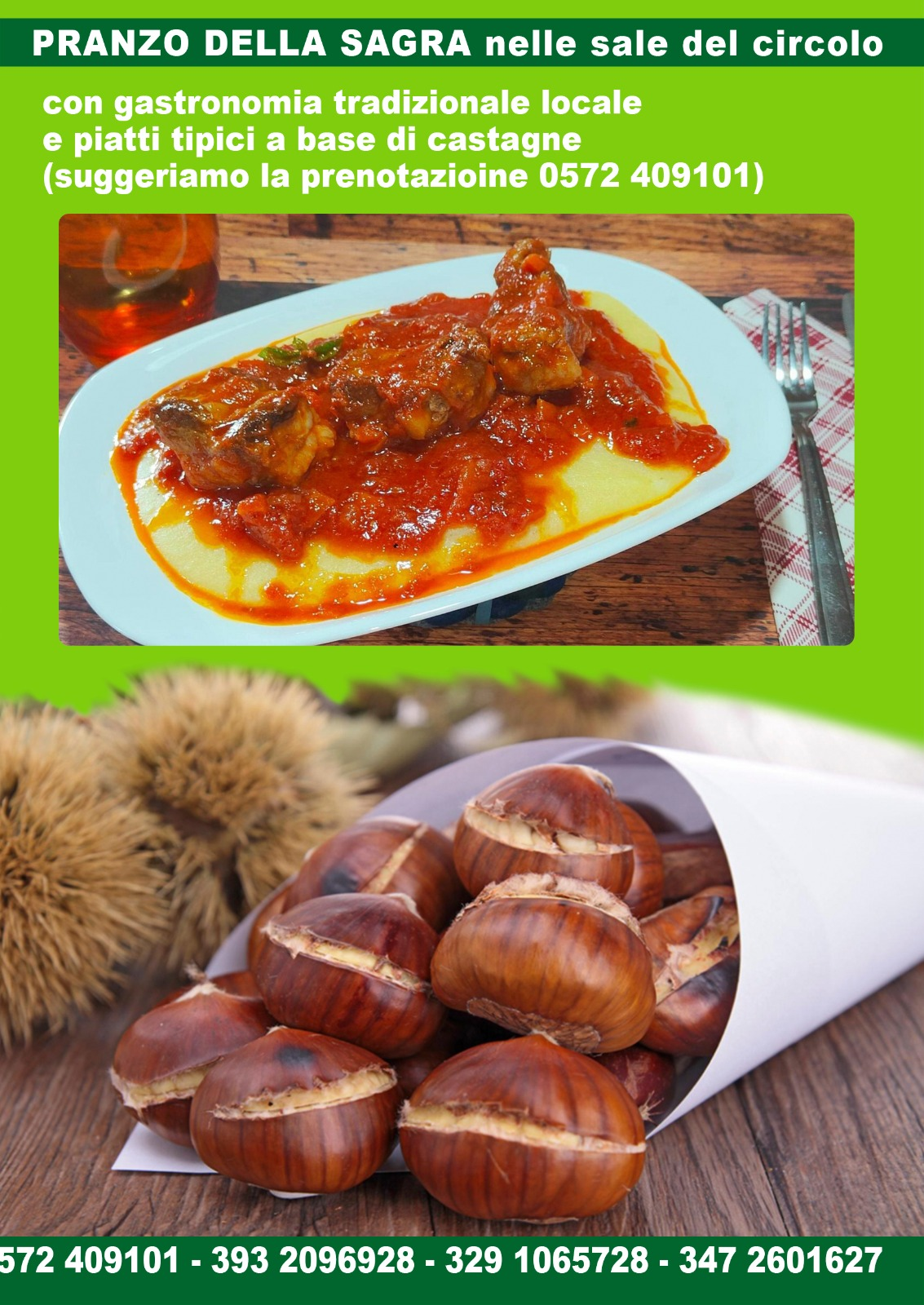 La sagra interesserà tutto il paese ed anche piazza della Resistenza verrà  coinvolta dalla festa con uno stand per necci, castagnaccio e tanti altri prodotti particolari: domenica 19 ottobre ci sarà lo spettacolo folcloristico proposto da Helga Battaglini mentre per la successiva domenica 26 è prevista la rappresentazione della vita di una piazza medievale con tanto di duelli e contese.