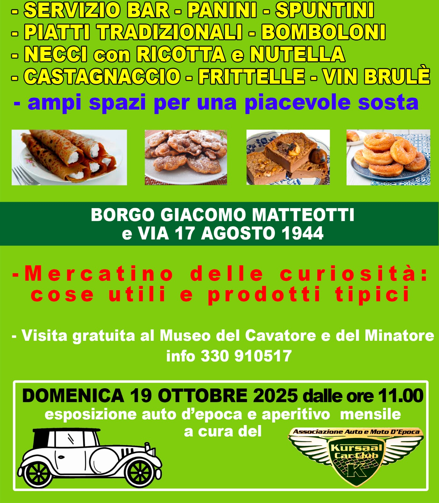 Interessante anche il programma di iniziative della successiva domenica 26 ottobre che prevede, tra le altre cose , un raduno di auto d'epoca organizzato in collaborazione con il Kursaal car club, ma di tutto questo avremo modo di scrivere più avanti. Info 0572 409101