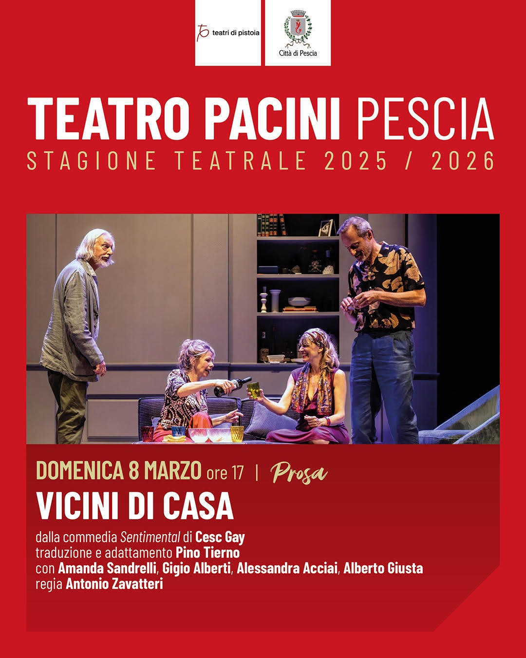 Commedia esilarante, libera e provocatoria, tratta dal testo di grande successo del regista spagnolo Cesc Gay, Los vecinos de arriba (divenuto anche un film nel 2020, Sentimental, a firma dello stesso autore, che ha conosciuto anche una versione italiana nel 2022), VICINI DI CASA, arriva sul palco del Teatro Pacini di Pescia, domenica 8 marzo alle ore 17. Proposta nella traduzione e adattamento di Pino Tierno, per la regia di Antonio Zavatteri, la commedia indaga con divertita leggerezza, inibizioni e ipocrisie del nostro tempo. Lo spettacolo è il settimo appuntamento della Stagione Teatrale 2025/26 promossa dal Comune di Pescia con Fondazione Teatri di Pistoia.